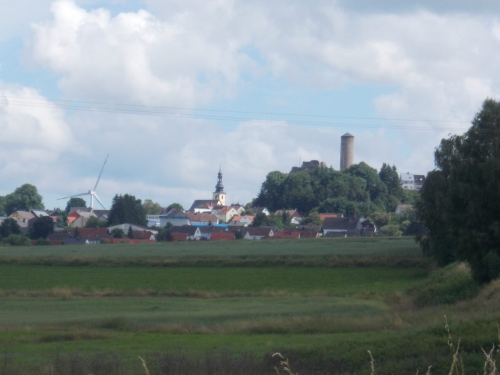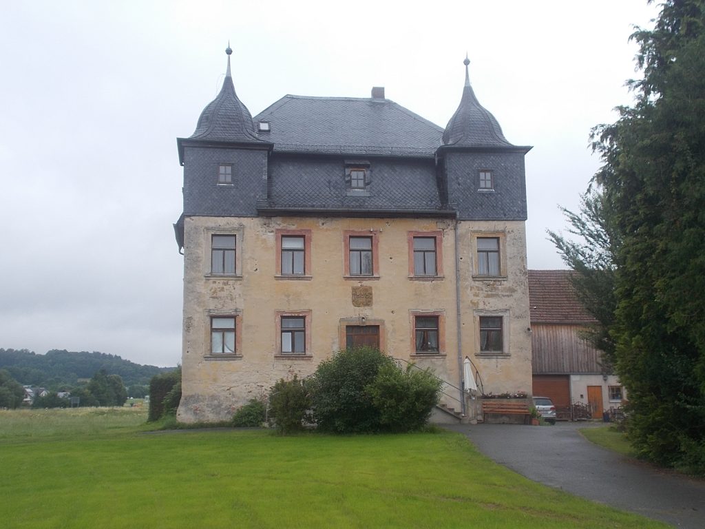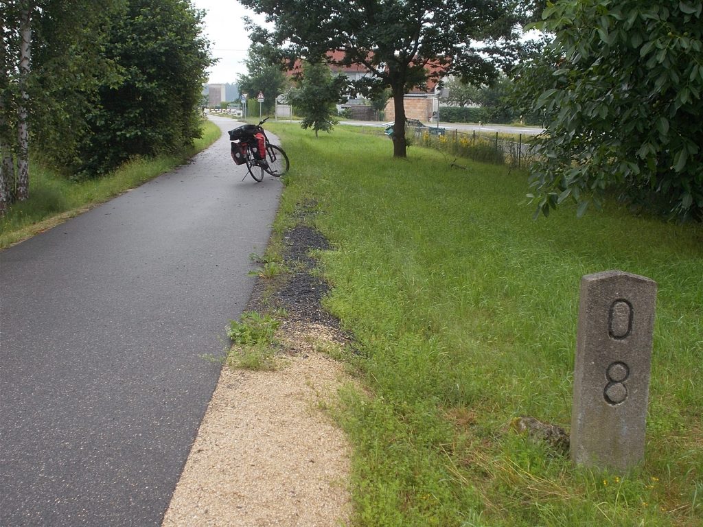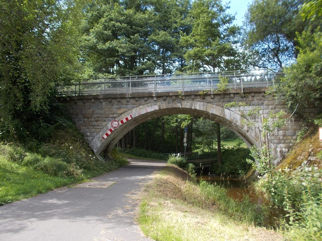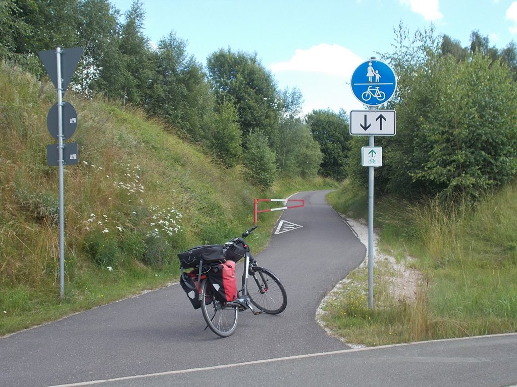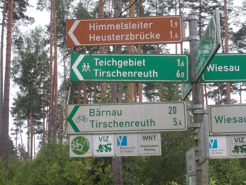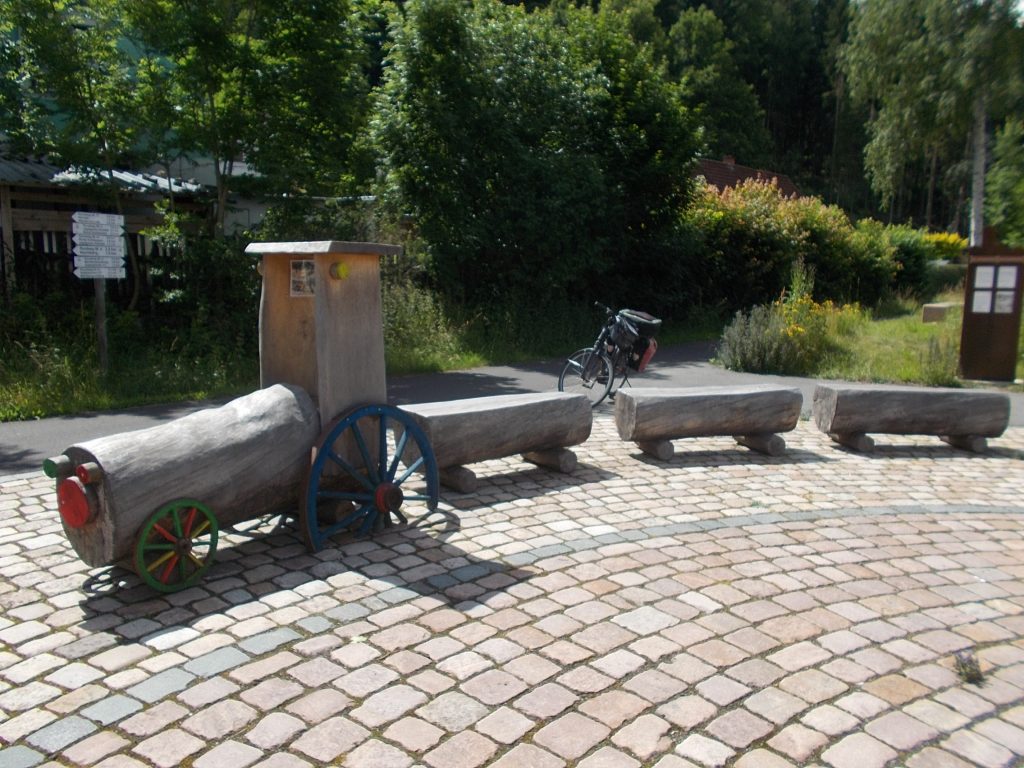 1. Tag: Bahnanreise nach Selb. Radtour Selb – Wunsiedel-Schönbrunn. 35 Tages-km. Mit dem Wetter hatte ich großes Glück: Lediglich an einem Vormittag (3. Tag) gab’s leichten Regen. Selb – Porzellanstadt.Renaturierung des Selbbaches, aber nur soweit sichtbar. Selbbachtal.Und was gibt’s heute? …… Bahntrassenradeln (zwischen Selb und Wunsiedel-Holenbrunn)! Die Kilometrierung beginnt in Hof Hbf und endet in Marktredwitz. Die alte Bahntrasse folgt zunächst dem Lauf des Selbbachs. Sie wird immer wieder unterbrochen durch die Autobahn A 93. Ich musste nur wieder den Zugang zur Trasse finden. Rechts neben dem Weg fließt die Eger.Am Bahnhofsplatz von Schwarzenhammer ist das hölzerne Bahnhofsgebäude schon 1986 bei Streckenstilllegung abgerissen worden. Auf einer Infotafel ist zu lesen, dass man damals von Paris bis hierher mit der Bahn reisen konnte.Blick auf Thierstein mit Kirche und Burg.Ab und zu geht es auch ‚mal bergauf.Hier am Bahnhof Wunsiedel-Holenbrunn endet der bisherige Bahnradweg. Hier verkehren Züge zwischen Hof und Marktredwitz. Auf der anderen Seite der Bahnlinie beginnt eine weitere, stillgelegte Bahntrasse …… und zwar nach Leupoldsdorf. Hier die Auffahrt zur Bahntrasse.Nun war es nicht mehr weit bis zum Hotel in Wunsiedel-Schönbrunn. Draußen sitzen bei einem kühlen Radler, Tourentagebuch schreiben, während der Pedelec-Akku an der öffentlichen Ladestation aufgeladen wird. 2. Tag: Radtour von WUN-Schönbrunn nach Bayreuth. 53 Tages-km. Die Brücke über die Rösla verheißt die Fortsetzung des Bahntrassenradelns nach Leupoldsdorf.Auch hier sind einzelne Bahnkilometer-Steine anzutreffen. 7,6 km seit Bhf WUN-Holenbrunn. Die Gesamtstrecke ist nur 10,5 km lang. Die evang. Christuskirche von Tröstau liegt außerhalb des Dorfes.Auf den letzten Kilometern der Bahntrasse ist diese unbefestigt. Nachdem es heute Morgen schon geregnet hat, ist der sandige Weg weich geworden. Diese „Drängelgitter“ gehören irgendwie zum Bahntrassenradeln dazu. Es wäre ohne diese einfach zu schön. Ende der Bahntrasse in Leupoldsdorf. Der Kilometerstein entspricht nicht der Tatsache. Ein Stück Gleis mit Güterwagen darauf als Erinnerung daran, dass hier einmal Züge verkehrten.Das „Hammerschloss“ aus dem 17. Jh. in Leupoldsdorf. „Hammer“ = Eisenhammer = Eisenverarbeitung.Ortschaft Meierhof. Ab jetzt geht’s heftig bergauf auf unbefestigten Waldwegen.Am Wegesrand.Die erste Anhöhe, der Rudolfsattel (Rudolfstein 866 müNN) ist geschafft. Zum Verschnaufen geht’s auch ‚mal bergab.Auch die zweite Anhöhe ist geschafft: 853 müNN. Endlich wieder Asphalt und nachhaltig (10 %) bergab.Schneller Fotohalt: Nordabfahrt – Schanze am Ochsenkopf (1.024 müNN).Bischofsgrün.Bischofsgrün.Jetzt lerne ich auch einmal den Weißen Main kennen.Und was kommt dann? Bahntrassenradeln von Bischofsgrün nach Bad Berneck.Immer schön am Weißen Main entlang. In Bad Bernau hat der Weiße Main Verstärkung durch die Olschnitz erhalten und ist ganz schön groß geworden.Benk, Markgrafenkirche St. Walburga.Bindlach, St. Bartholomäuskirche. Jetzt ist es nicht mehr weit bis zum Hotel in Bayreuth.3. Tag: Zweimal Bahntassenradeln ab/bis Bayreuth. 83 Tageskilometer. Die 1. Trasse führt ab Stadtrand nach Hollfeld.Im leichten Regen durchs Truppachtal.Vor Obernsees die St. Rupert-Kapelle.Truppach, Schloss Truppach mit angrenzender Landwirtschaft.Gut versteckt: Schloss Plankenfels.Höhenburg in Wadendorf. Die Burg Wadendorf wurde 1453 erstmals urkundlich erwähnt und liegt auf einem Hügel in unmittelbarer Nähe zum Fluss Wiesent. Südliche Ringmauer mit zwei Rundtürmen, zweigeschoss. Hauptgebäude sowie Reste der Toranlage bilden die Höhenburg. Bei Stechendorf.Das historische Rathaus der Stadt Hollfeld. Trotz „Ruhetag“ darf ich die Außensteckdose dazu nutzen, den Pedelec-Akku nachzuladen. Gleich rechts neben dem Rathaus das „Wittauer Haus“, heute Musikschule. Die Familie Wittauer ist 1926 nach Amerika ausgewandert.Marienplatz.Die ehemalige Kirche St. Gangolf, heute Kulturzentrum.Blick auf die Stadt Hollfeld.Das Obere Tor.Pfarrkirche St. Mariä Himmelfahrt.Innenansicht.Auf dem Weg zur nächsten Bahntrasse muss ein Höhenzug überwunden werden. Dieses schöne Fachwerkhaus steht in Krögelstein.In Wonsees Mittagspause im Café am Marktplatz.Wonsees.Im Ortsteil Sanspareil Burg Zwernetz, staufische Burganlage um 1200. Ebenfalls in Sanspareil: „Morgenländischer Bau“, 1746-1747 erbaut, ein Schlösschen mit rückwärtigem Wohntrakt, nicht einsehbar. Das war der Küchenbau des Schlösschens, heute Café. Dazwischen kleine Parkanlage. Nach rasanter Talfahrt Ankunft am Marktbrunnen in Thurnau.Schloss Thurnau (Hotel).Schloss Thurnau, Seeseite.Es ist inzwischen heiß geworden. Wohltuender Schatten über der 2. Bahntrasse des Tages. Die ehemalige Bahntrasse ist hier Teil des Main-Radwegs.Auf der Brücke über den Roten Main bei Altdrossenfeld.Markgrafenkirche und … … Schloss Neudrossenfeld, ehemaliges Rittergut, seit 1993 öffentiche (Standesamt) und private (Restaurant) Nutzung. Auf dem Main-Radweg zurück zum Hotel in Bayreuth. 4. und letzter Tag: Bahntransfer Bayreuth – Wiesau, Radtour Wiesau – Tirschenreuth – Bärnau – Plößberg – Weiden(Oberpfalz) Bhf. Bahnheimreise. 67 Tageskilometer. – Wieder Bahntrassenradeln, und zwar auf dem Vizinalbahn-Radweg Wiesau – Bärnau. Im Gebiet der Gemeinden Wiesau, Tirschenreuth und Bärnau asphaltiert, ansonsten wassergebunden. Der morgendliche Regenschauer hat mit Verlassen des Zuges aufgehört. Kurz vor Bärnau wird sogar die Sonne heraus kommen. Der Schilderwald zeigt u.a. an, dass ich ab hier auch auf dem Waldnaabtal-Radweg unterwegs bin. Die Waldnaab entspringt südöstlich von Tirschenreuth … … und durchfließt das „Land der tausend Teiche“. Es sind sogar mehr als 2.500 Teiche. In Neustadt an der Waldnaab (NEW) werde ich der Waldnaab wieder begegnen.Die „Himmelsleiter“, 2012 errichtet, 95 Stufen nach oben, und …… es