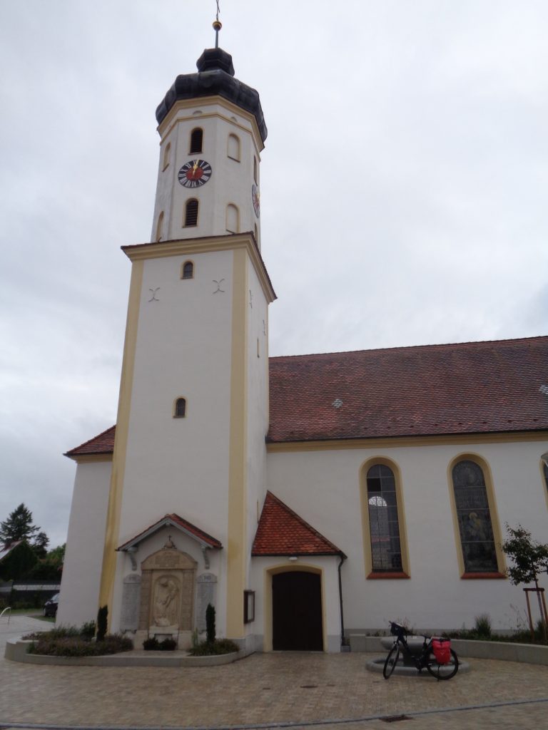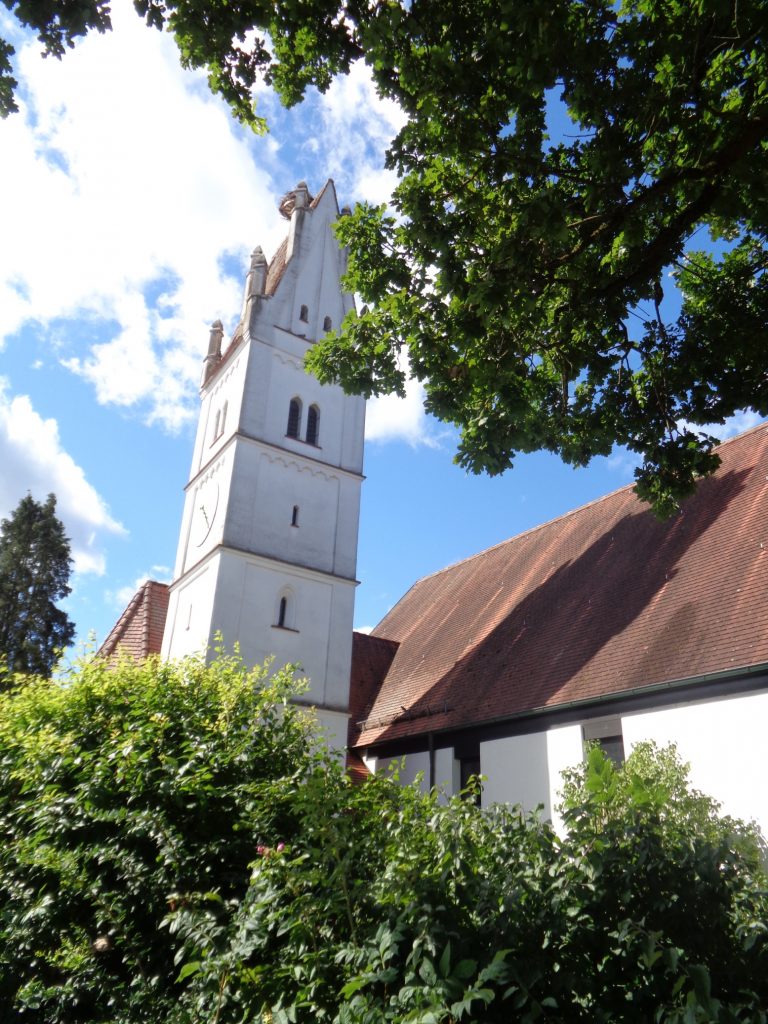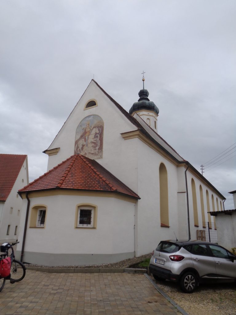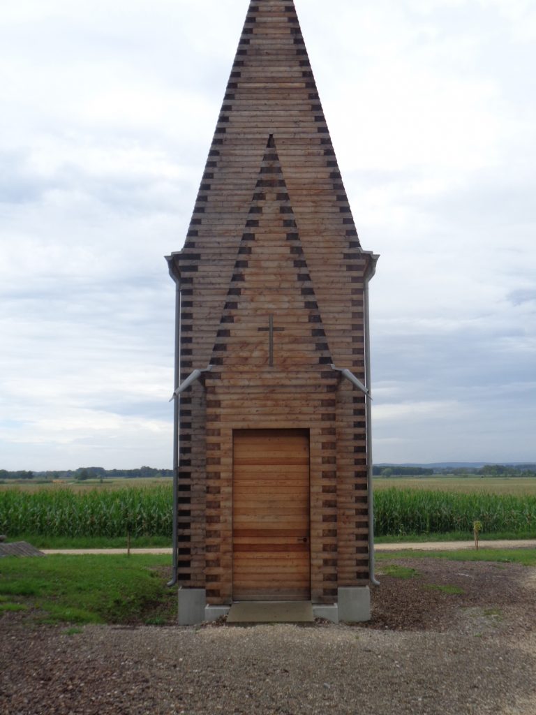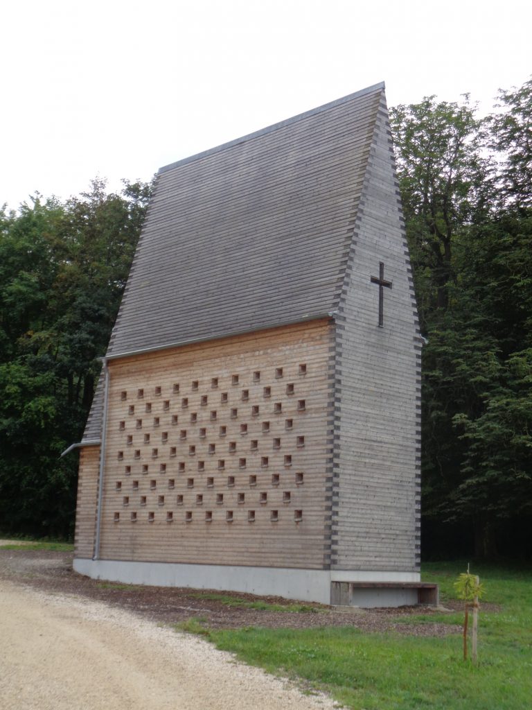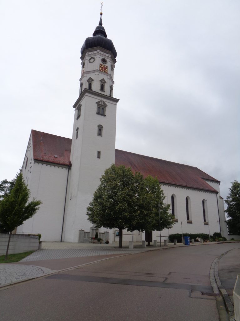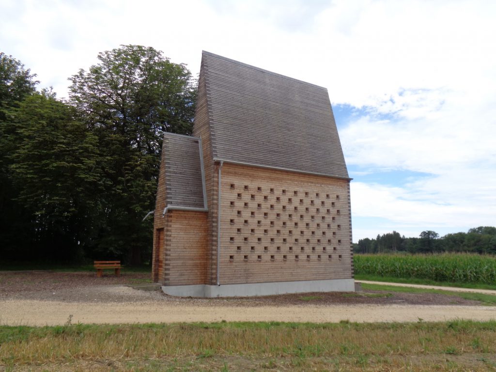 Tag 3: Start und Ziel ist heute die Kreisstadt Dillingen. Heute wird es nicht regnen. Zuerst durchs flache Donautal nach Holzheim. Im rechten Bilddrittel die Kühltürme des ehem. Atomkraftwerkes Gundremmingen.Holzheim.Hoch über Holzheim (Sackgasse) steht die Sebastianskapelle.Verschlossen, aber durch ein kleines Fenster gelingt mir diese Innenaufnahme.Kirche in Ellerbach Gde. Holzheim.Die Kirche ist offen. Zusamzell. Kirche mit Storchennest.Die 7. und damit die letzte: Kapelle bei Emersacker von Wilhelm Huber. Durch eine Schiebetür betritt man das Innere der Kapelle. – Die Kapelle steht an einer kleinen Waldlichtung im engen Tal der natürlich dahinfließenden Laugna. Der an sich weiße Innenraum erhält sein Licht ausschließlich über ein Oberlicht aus blauem, mundgeblasenen Glas, welches die Wände anstrahlt. Der Raum mit einem einfachen, geflammten Metallkreuz ist ein Ort der Stille und ermöglicht Meditation. Äußerlich wirkt die Kapelle wie ein hölzerner, 12 m hoher Turmbau, zugleich ähnlich einem großen Baumstumpf. .Villenbach. Die Kirche ist offen, aber es findet gerade ein Gottesdienst statt..Donaubrücke bei Dillingen. Damit endet auch meine Radreise zu den 7 Wegkirchen. – 49 Tages-km.Es folgen noch einige Bilder von der Kreisstadt Dillingen an der Donau.