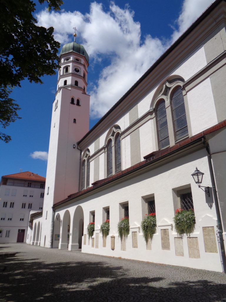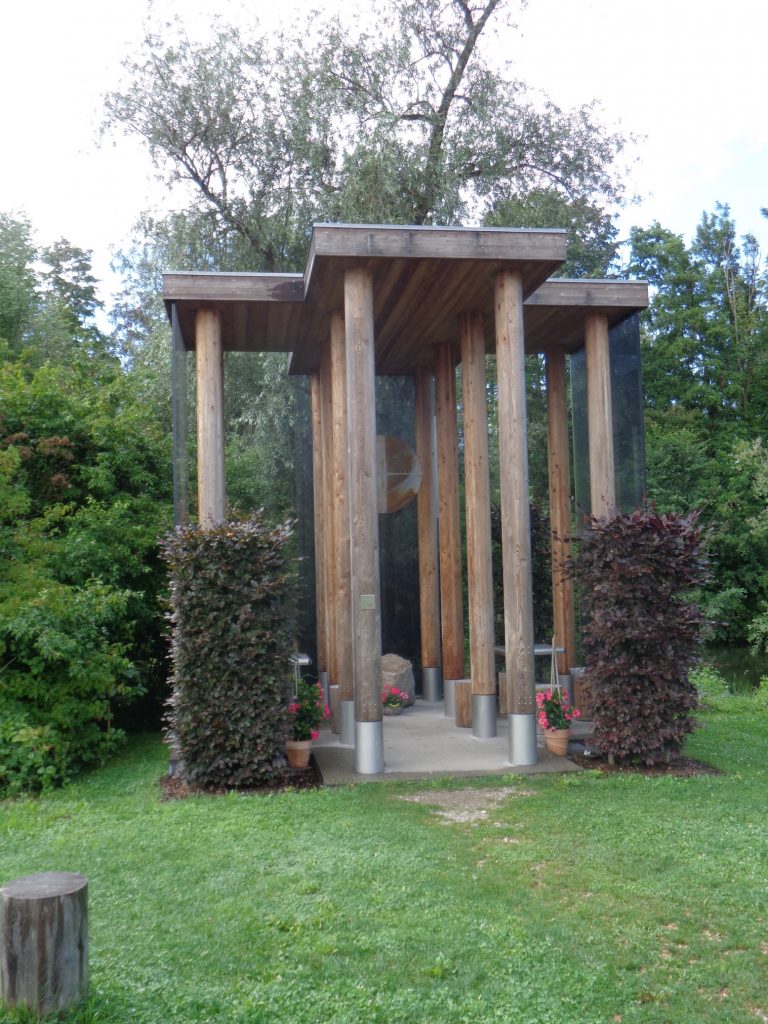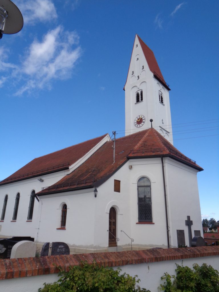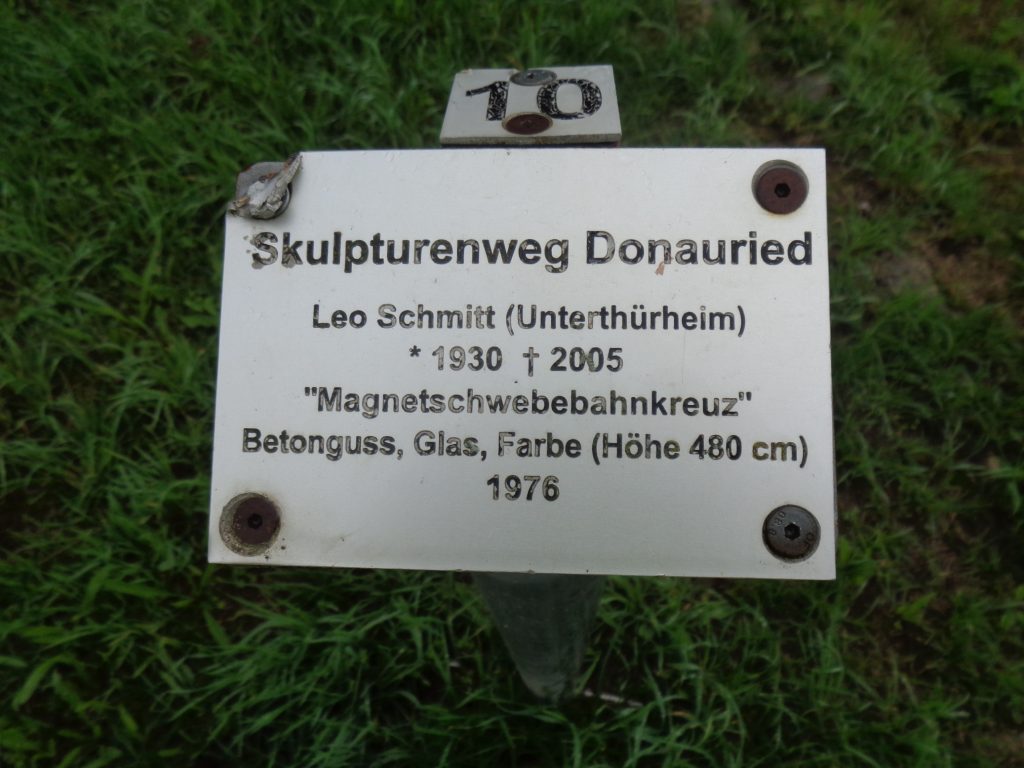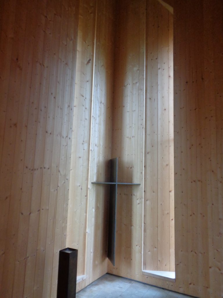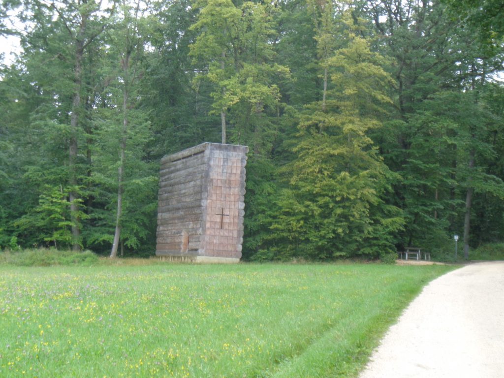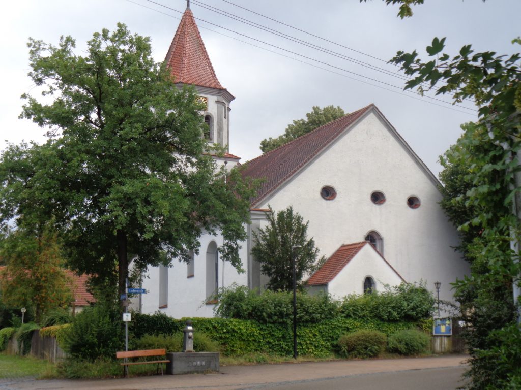 Tag 3: Start und Ziel ist heute die Kreisstadt Dillingen. Heute wird es nicht regnen. Zuerst durchs flache Donautal nach Holzheim. Im rechten Bilddrittel die Kühltürme des ehem. Atomkraftwerkes Gundremmingen.Holzheim.Hoch über Holzheim (Sackgasse) steht die Sebastianskapelle.Verschlossen, aber durch ein kleines Fenster gelingt mir diese Innenaufnahme.Kirche in Ellerbach Gde. Holzheim.Die Kirche ist offen. Zusamzell. Kirche mit Storchennest.Die 7. und damit die letzte: Kapelle bei Emersacker von Wilhelm Huber. Durch eine Schiebetür betritt man das Innere der Kapelle. – Die Kapelle steht an einer kleinen Waldlichtung im engen Tal der natürlich dahinfließenden Laugna. Der an sich weiße Innenraum erhält sein Licht ausschließlich über ein Oberlicht aus blauem, mundgeblasenen Glas, welches die Wände anstrahlt. Der Raum mit einem einfachen, geflammten Metallkreuz ist ein Ort der Stille und ermöglicht Meditation. Äußerlich wirkt die Kapelle wie ein hölzerner, 12 m hoher Turmbau, zugleich ähnlich einem großen Baumstumpf. .Villenbach. Die Kirche ist offen, aber es findet gerade ein Gottesdienst statt..Donaubrücke bei Dillingen. Damit endet auch meine Radreise zu den 7 Wegkirchen. – 49 Tages-km.Es folgen noch einige Bilder von der Kreisstadt Dillingen an der Donau.
