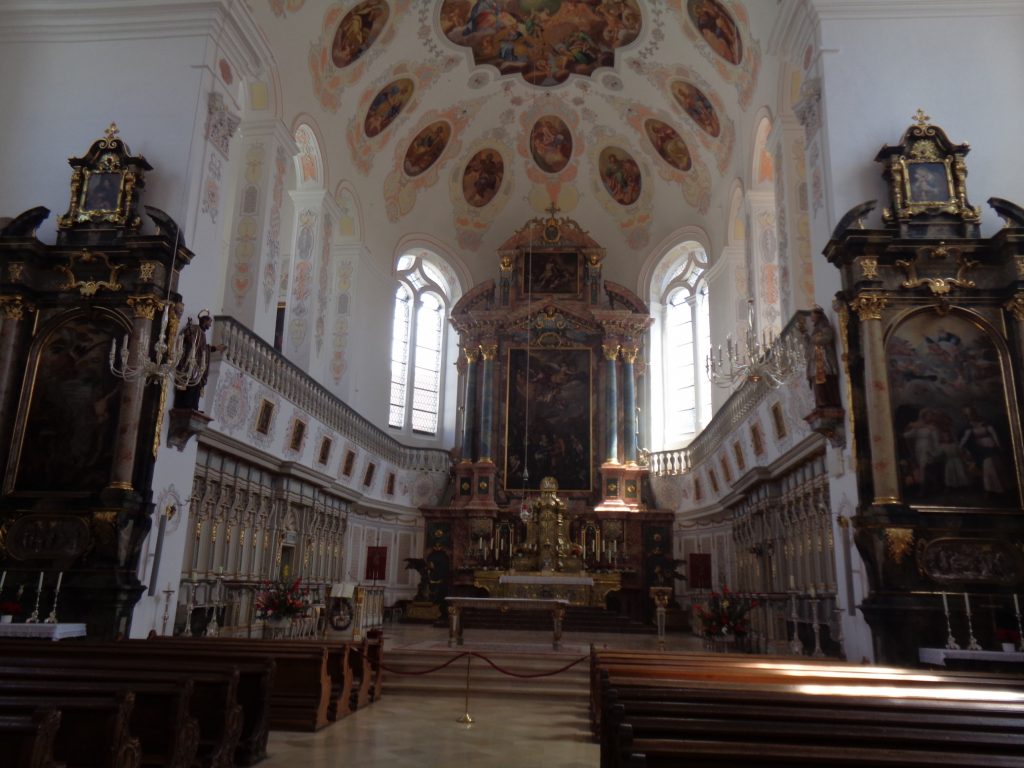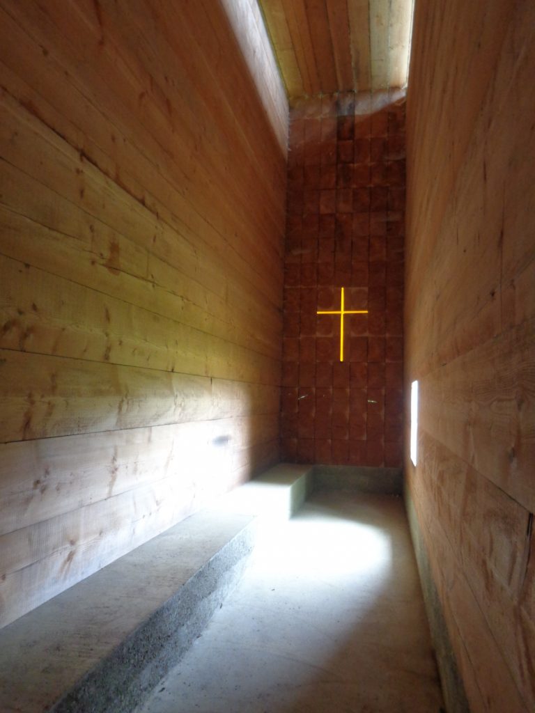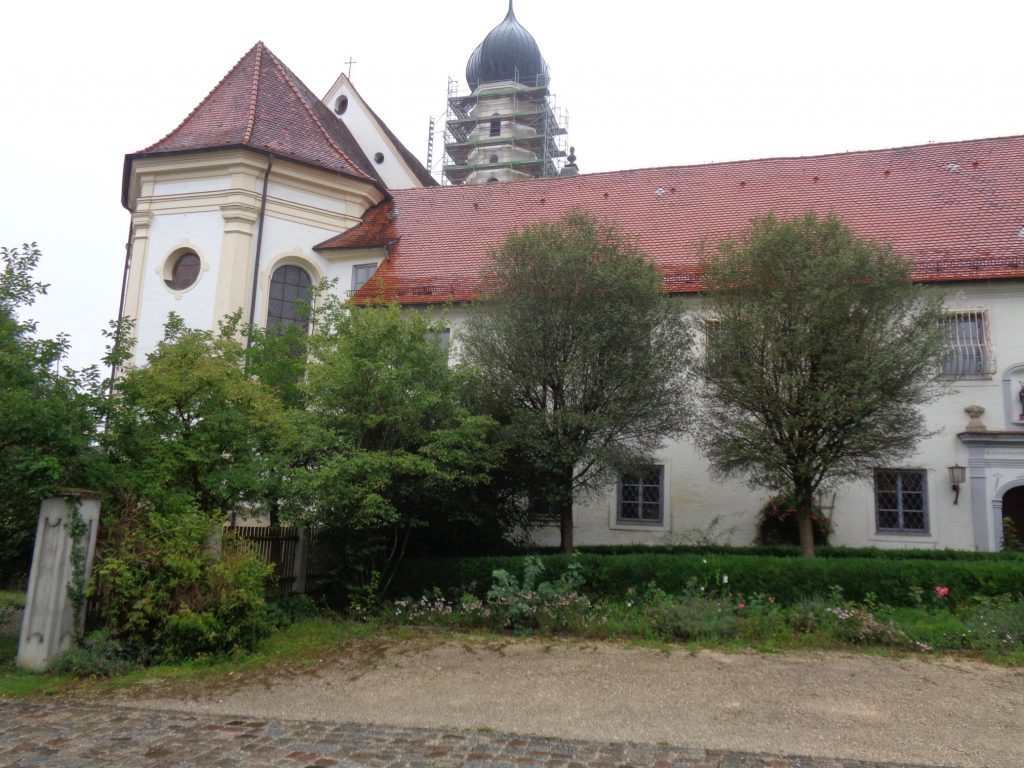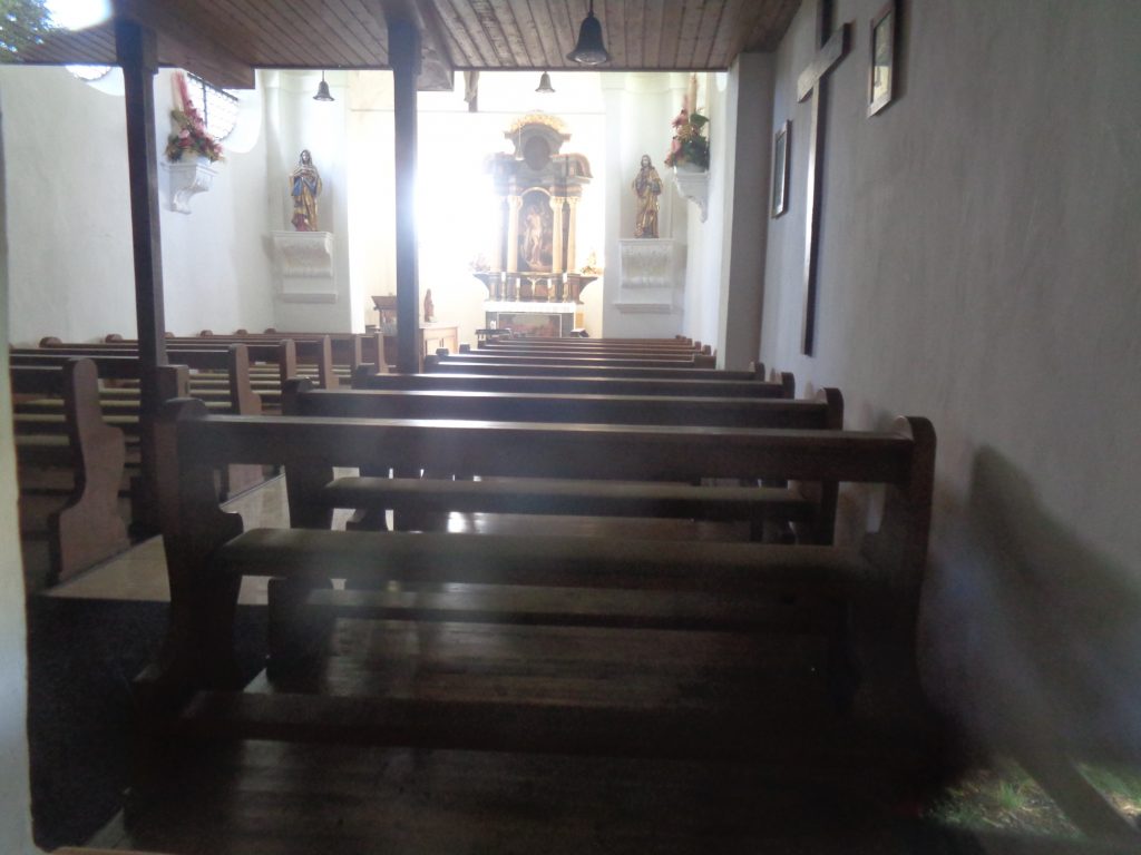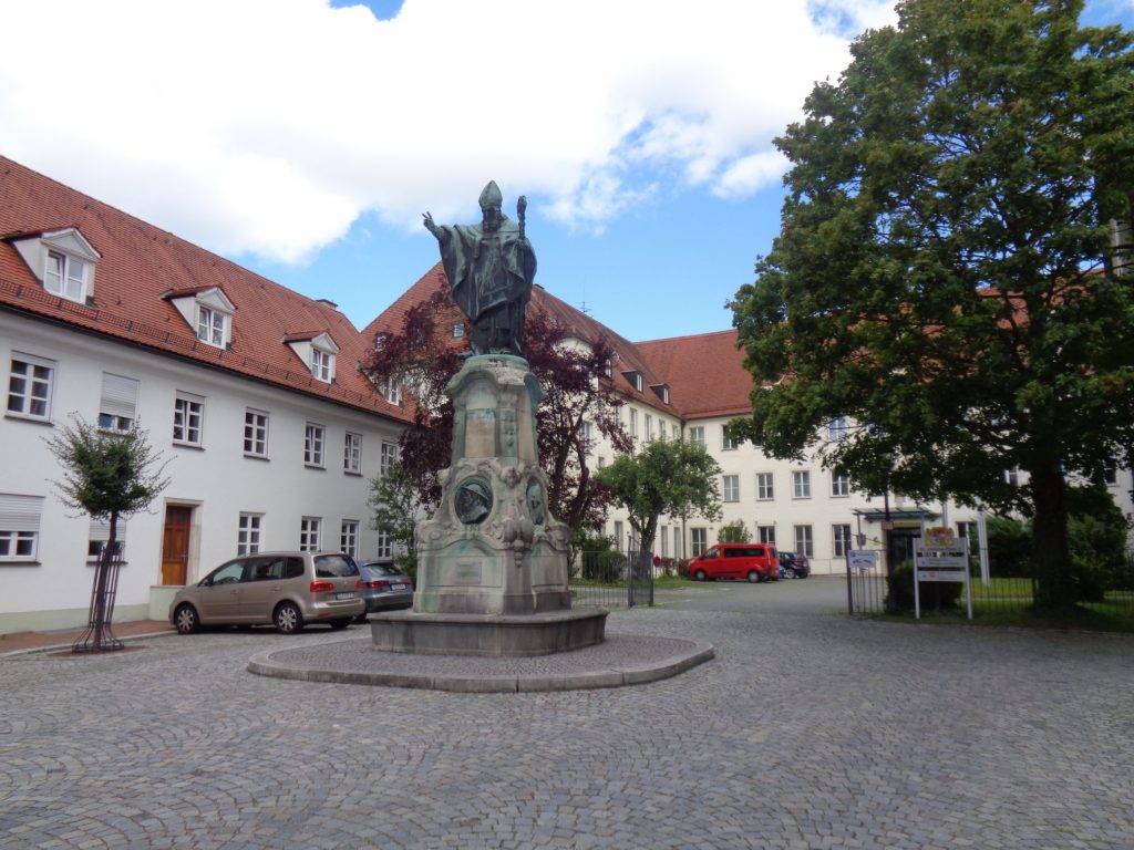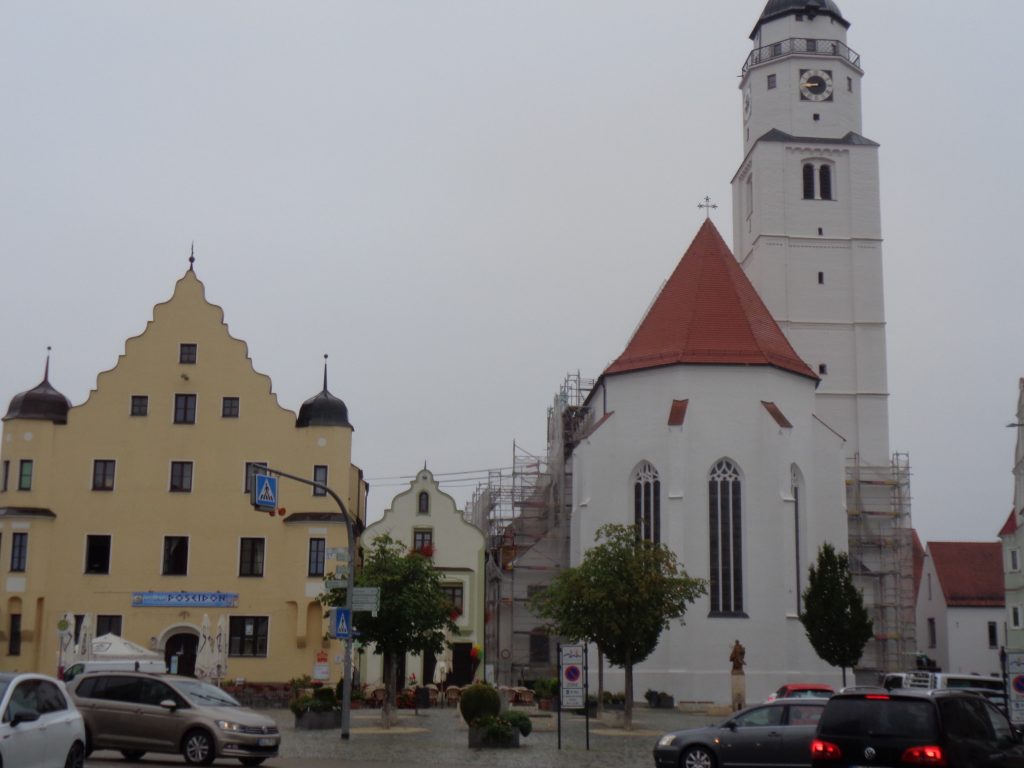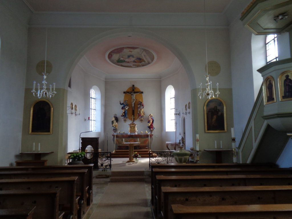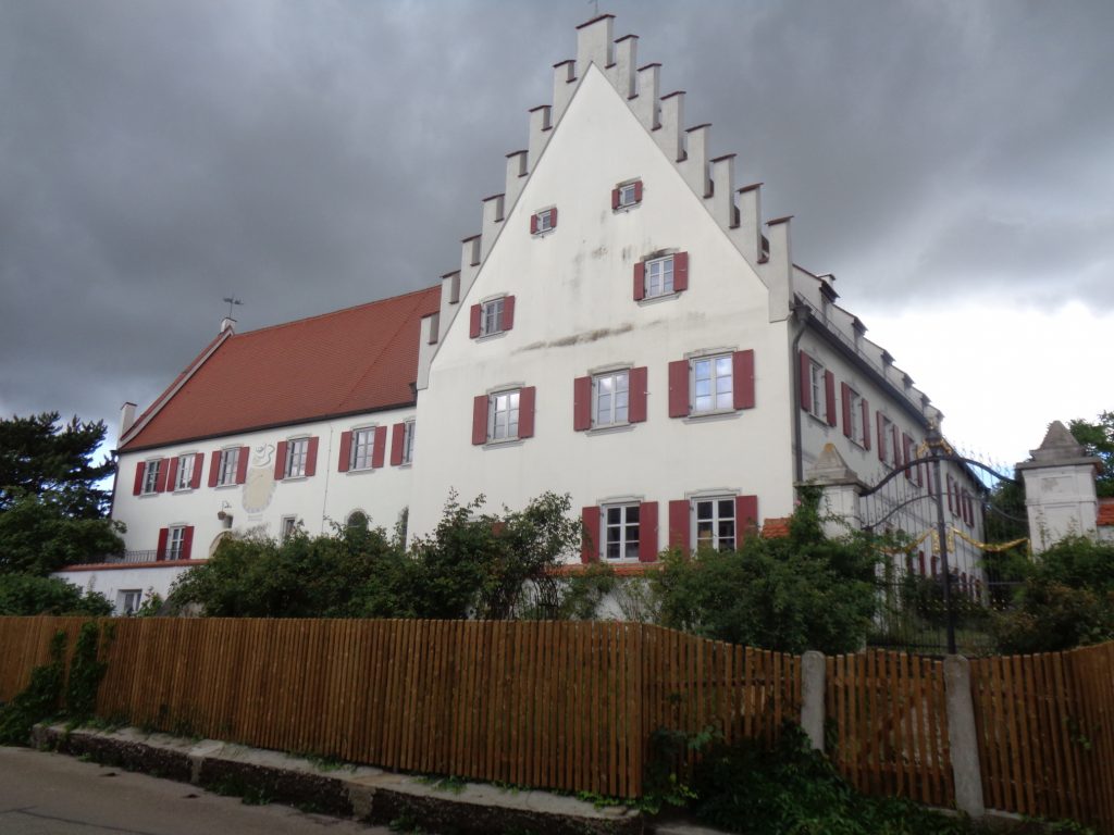 Tag 3: Start und Ziel ist heute die Kreisstadt Dillingen. Heute wird es nicht regnen. Zuerst durchs flache Donautal nach Holzheim. Im rechten Bilddrittel die Kühltürme des ehem. Atomkraftwerkes Gundremmingen.Holzheim.Hoch über Holzheim (Sackgasse) steht die Sebastianskapelle.Verschlossen, aber durch ein kleines Fenster gelingt mir diese Innenaufnahme.Kirche in Ellerbach Gde. Holzheim.Die Kirche ist offen. Zusamzell. Kirche mit Storchennest.Die 7. und damit die letzte: Kapelle bei Emersacker von Wilhelm Huber. Durch eine Schiebetür betritt man das Innere der Kapelle. – Die Kapelle steht an einer kleinen Waldlichtung im engen Tal der natürlich dahinfließenden Laugna. Der an sich weiße Innenraum erhält sein Licht ausschließlich über ein Oberlicht aus blauem, mundgeblasenen Glas, welches die Wände anstrahlt. Der Raum mit einem einfachen, geflammten Metallkreuz ist ein Ort der Stille und ermöglicht Meditation. Äußerlich wirkt die Kapelle wie ein hölzerner, 12 m hoher Turmbau, zugleich ähnlich einem großen Baumstumpf. .Villenbach. Die Kirche ist offen, aber es findet gerade ein Gottesdienst statt..Donaubrücke bei Dillingen. Damit endet auch meine Radreise zu den 7 Wegkirchen. – 49 Tages-km.Es folgen noch einige Bilder von der Kreisstadt Dillingen an der Donau.