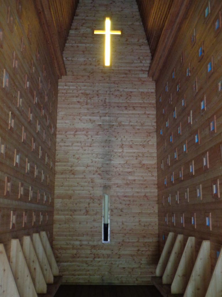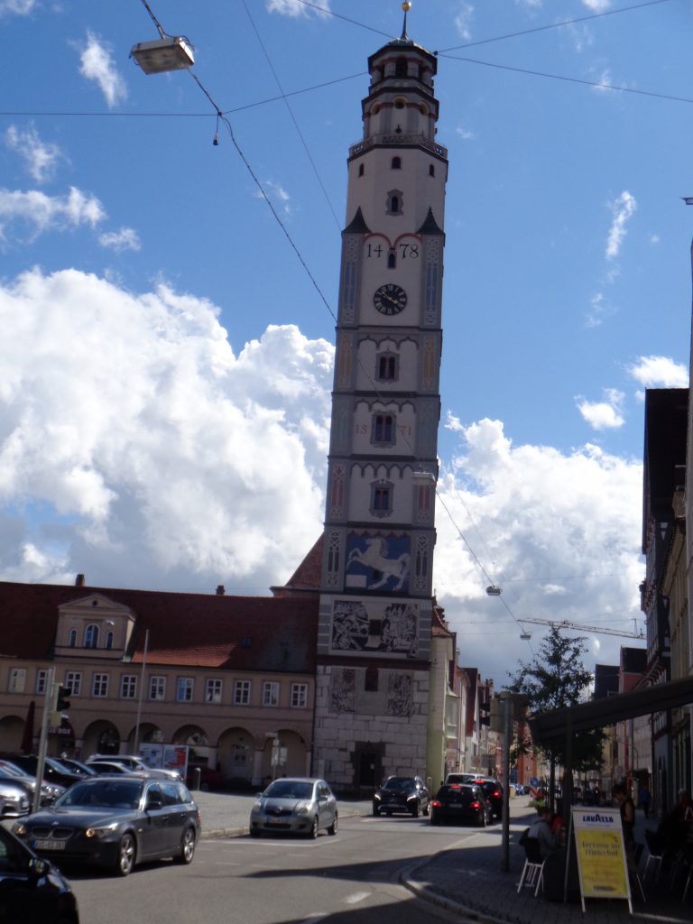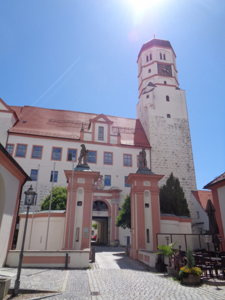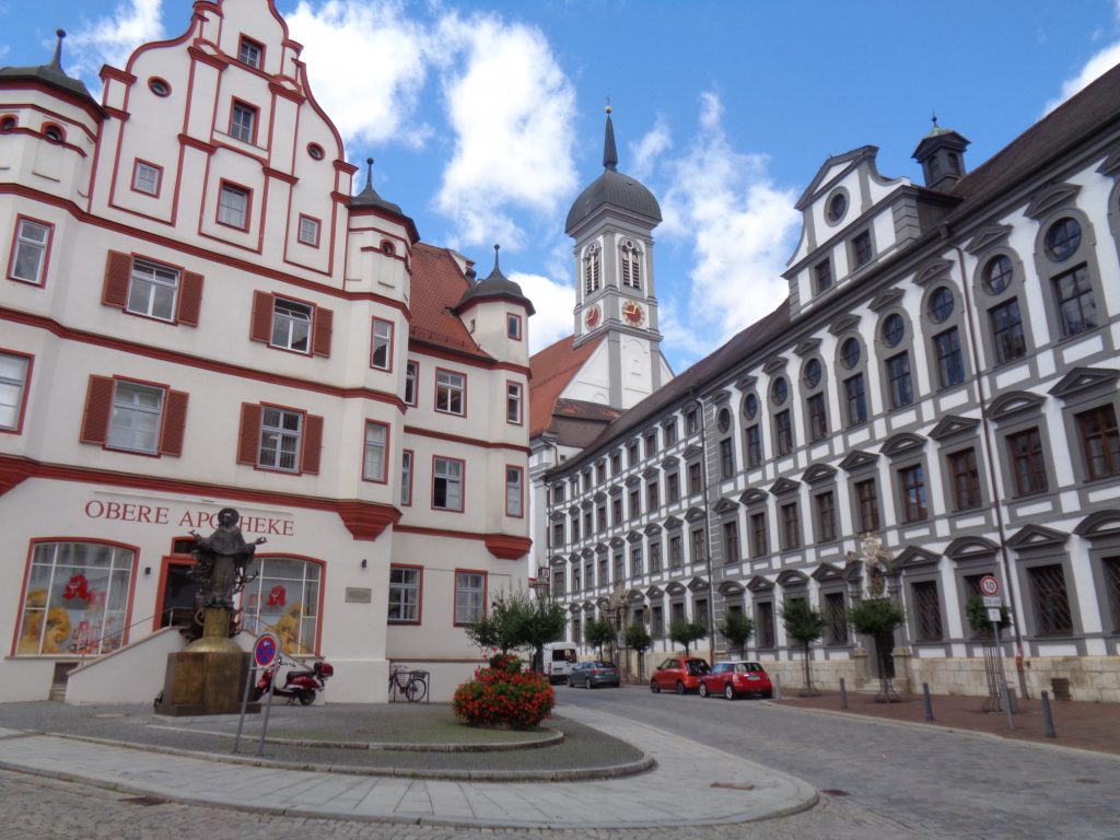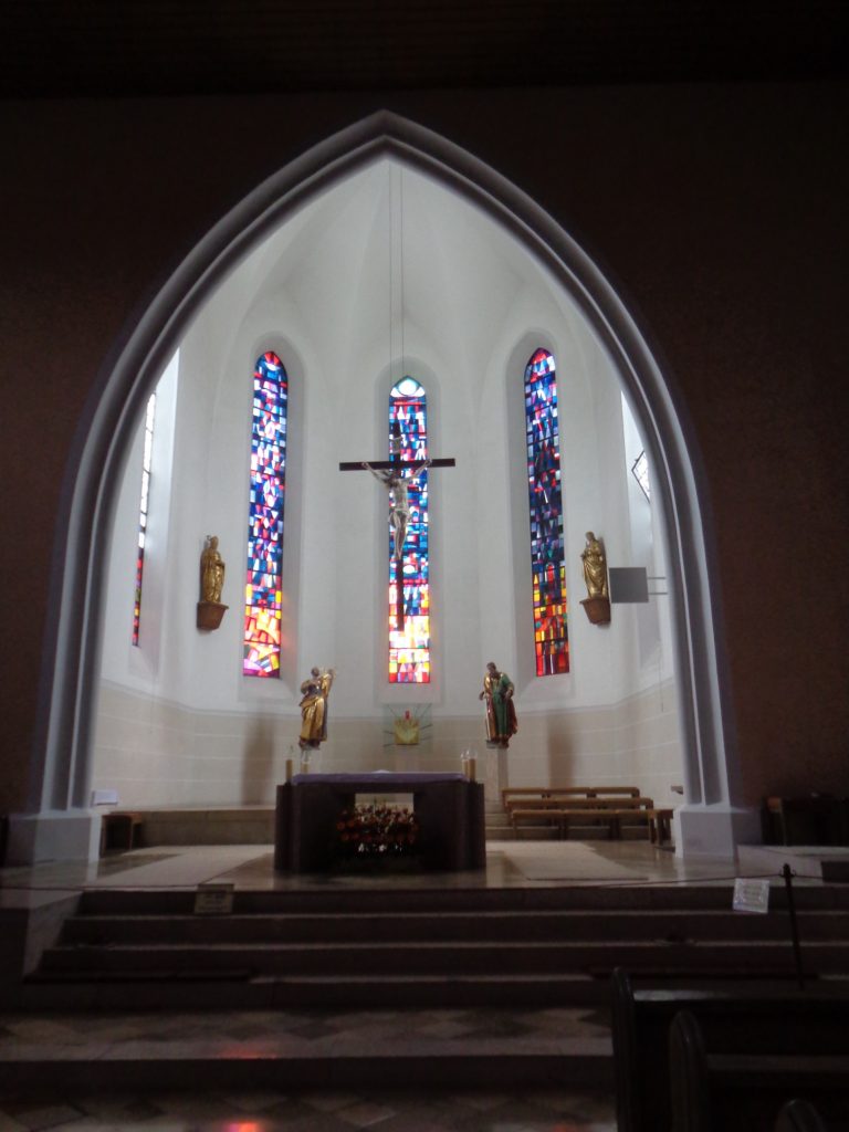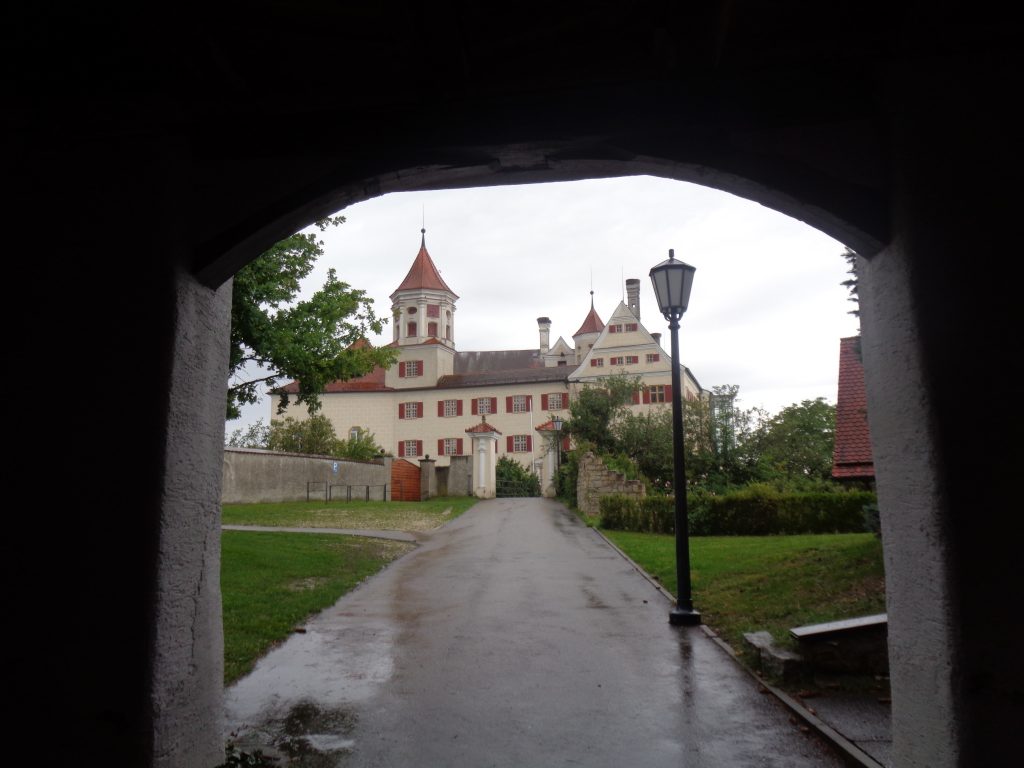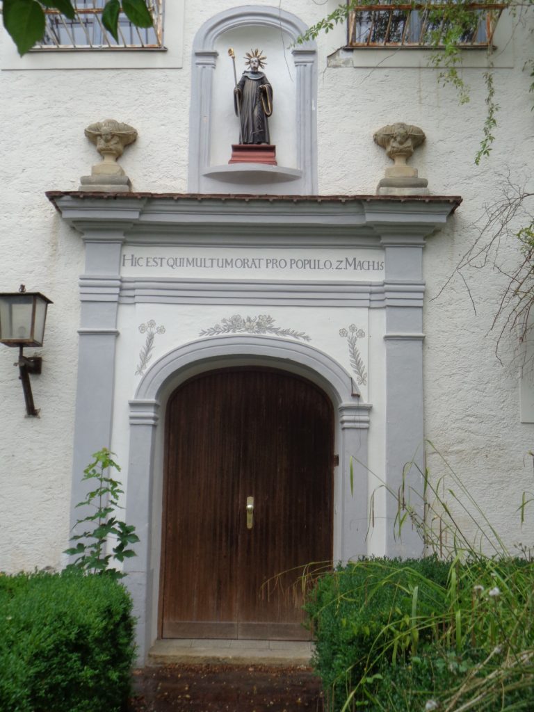 Tag 3: Start und Ziel ist heute die Kreisstadt Dillingen. Heute wird es nicht regnen. Zuerst durchs flache Donautal nach Holzheim. Im rechten Bilddrittel die Kühltürme des ehem. Atomkraftwerkes Gundremmingen.Holzheim.Hoch über Holzheim (Sackgasse) steht die Sebastianskapelle.Verschlossen, aber durch ein kleines Fenster gelingt mir diese Innenaufnahme.Kirche in Ellerbach Gde. Holzheim.Die Kirche ist offen. Zusamzell. Kirche mit Storchennest.Die 7. und damit die letzte: Kapelle bei Emersacker von Wilhelm Huber. Durch eine Schiebetür betritt man das Innere der Kapelle. – Die Kapelle steht an einer kleinen Waldlichtung im engen Tal der natürlich dahinfließenden Laugna. Der an sich weiße Innenraum erhält sein Licht ausschließlich über ein Oberlicht aus blauem, mundgeblasenen Glas, welches die Wände anstrahlt. Der Raum mit einem einfachen, geflammten Metallkreuz ist ein Ort der Stille und ermöglicht Meditation. Äußerlich wirkt die Kapelle wie ein hölzerner, 12 m hoher Turmbau, zugleich ähnlich einem großen Baumstumpf. .Villenbach. Die Kirche ist offen, aber es findet gerade ein Gottesdienst statt..Donaubrücke bei Dillingen. Damit endet auch meine Radreise zu den 7 Wegkirchen. – 49 Tages-km.Es folgen noch einige Bilder von der Kreisstadt Dillingen an der Donau.