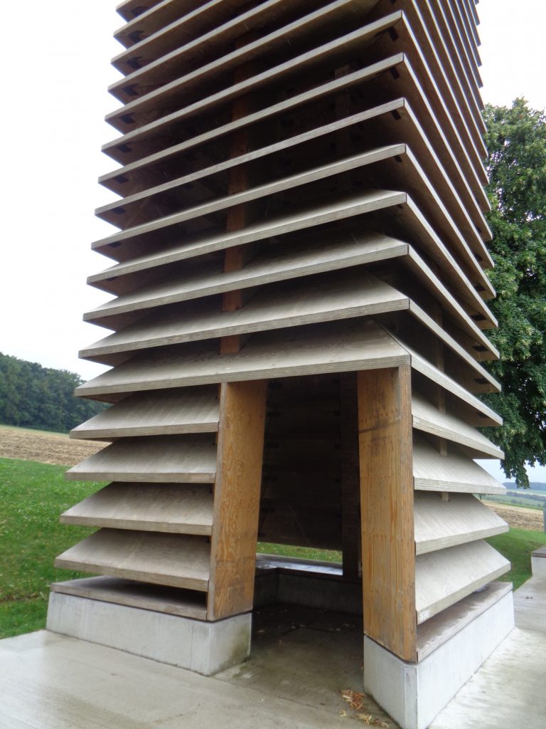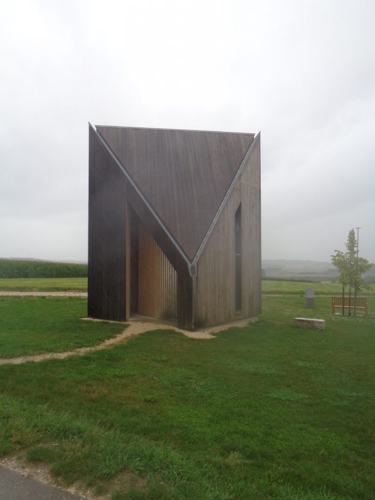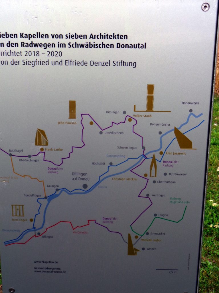 Tag 1: WoMo-Anreise nach Lauingen an der Donau. Start zur 1. Radtour zu den Wegkapellen. – Auf dem Weg zur ersten Wegkapelle Halt an der Kapelle in Birkach Höfe. Die Historie dieser (verschlossenen) Kapelle ist auf obiger Tafel beschrieben. Am 1. Tag sind zwei Wegkapellen mein Ziel: die Kapelle Oberbechingen des Architekten Frank Lattke und die Kapelle Gundelfingen des Architekten Hans Engel. Am 2. Tag folgen die Kapellen in Unterliezheim (John Pawson), in Kesselostheim (Staab Architekten), in Ludwigschwaige (Alen Jasarevic) und in Oberthürheim (Christoph Mäckler). Am 3. Tag folgt dann noch die Kapelle in Emersacker des Architekten Wilhelm Huber.Durch die unterschiedlich gestalteten Fassaden und die Höhe des diagonal zum Grundriss verlaufenden Dachfirsts scheint die Kapelle in Oberbechingen wie in Bewegung zu sein. Die Augen richten sich auf das Kreuz im Licht, Hell und Dunkel modellieren den Raum.Sanftes Seitenlicht fällt über hohe Fensterschlitze auf das Kreuz, das Weihwasserbecken und den Kerzenständer. Der Blick geht in das tiefergelegene Ried …… und die ansteigende Landschaft der Schwäbischen Alb.Oberbechingen.Oberbechingen.Kirche Mariä Himmelfahrt in Bachhagen.Bachhagen.Die Brenz bei Giengen. Sie begleitet meinen Weg bis zur Donau. Der Brenzturm bei Hermaringen.Blick von oben. Blick auf Brenz, einem Stadtteil von Sontheim. Galluskirche in Brenz.Durchs Tor zum Schloss Brenz.Das SchlossBrenz wurde 1672 im Renaissancestil erbaut, 1847 von der Gemeinde erworben, Schule und Rathaus, seit 1906 mit ältestem Dorfmuseum in Baden-Württemberg.Bächingen.Hinter dem Gehölz links versteckt sich das Schloss Bächingen (Privatbesitz). Im Grundelfinger Stadtteil Peterswörth, direkt am Donautal-Radweg steht die 2. Wegkapelle. Sie hat einen quadratischen, kreuzförmigen Grundriss (5,06 m), der einen offenen Raum bildet. Zwölf gedrechselte Rundsäulen im Raster von 1,5 m tragen ein flaches Holzdach. Die Konstruktion mutet an wie ein kleiner römischer Tempel, der drei raumhohe Glaswände besitzt. In der 5,06 m hohen Kapelle hängt eine runde Farbglasscheibe von Anita Rist-Geiger, in die ein Kreuz eingeschrieben ist. Das „Rosenschloss“ in Gundelfingen.Die Brenz bei Lauingen, kurz vor ihrer Mündung in die Donau.Links die Donau, rechts die Brenz.Tagestour endet am Marktplatz mit Rathaus in Lauingen. – 60 Tages-km.Albertus Magnus war Universalgelehrter, zugleich Philosoph, Jurist, Naturwissenschaftler, Theologe, Dominikaner und Bischof von Regensburg. Geboren in Lauingen an der Donau. Der Schimmelturm oder Hofturm, erbaut 1457 bis 1478.Lauingen.Am Donauufer. Tag 2: Die heutige Tagestour beginnt am Schloss in Höchstädt an der Donau. Höchstädt an der Donau.Höchstädt an der Donau. 1. Halt am ehemaligen Kloster und der Kirche in Unterliezheim.Klosterpforte.Klosterbrauerei, seit 1996 vom Förderverein Klosterbräu e.V. betrieben.Wegkapelle Nr. 3: ein Holzstapel mit Kreuz?40 Douglasien mit einer Länge von ca. 12,5 m und einem Durchmesser von 90 cm standen für den Bau zur Verfügung.Die Kapelle von John Pawson steht oberhalb von Unterliezheim zu zwei Dritteln im Wald. Sie erwächst aus dem Wald. Die geschichteten Baumstämme wirken monumental und zugleich völlig selbstverständlich und natürlich.Blick aus dem einzigen Fenster der Kapelle …… auf Unterliezheim.Blick auf Markt Bissingen.Pfarrkirche Peter und Paul in Markt Bissingen.Schloss in Bissingen.Markt Bissingen.Kapelle Kesselostheim von Volker Staab (4. Kapelle). Die quadratische Grundfläche beträgt vier Meter, sie ist etwa 14 Meter hoch. Vier kreuzförmig angeordnete Schichtholzbauteile tragen die quadratisch eingebauten Lamellen und werden an der Spitze durch ein Kreuz verbunden. Blick in den offenen Himmel. Den Vorplatz schließt eine Wandscheibe mit eingelassener Bank ab. Blick ins Tal der Kessel. Das Tal der Kessel zwischen Niederbissingen (links) und Kesselostheim (rechts). Ich folge dem Tal der Kessel in Richtung Donau, …… die ich bei Erlingshofen überquere.Die Wegkapelle bei Ludwigschwaige von Alen Jasarevic, umgeben von Donauwäldern mit Eschen, Eichen und Ahorn. Die Grundidee des Entwurfs bilden zum Gebet gefaltete Hände. Die Kapelle in Form eines ansteigenden Zeltdaches ist 12 m hoch, 6 m lang und besteht aus drei 14 cm starken Brettsperrholzplatten, die durch ein Kreuz verbunden sind. Ihre Breite verjüngt sich von 5 auf 2 m. Im Innern scheint sich die Oberfläche im Licht zu bewegen. .. Blick über die Niederung des Donautals. In der Bildmitte das Hofgut Bäldleschwaige.Der richtige Platz für die Mittagsrast. Es tröpfelt nur noch, und bald bricht die Sonne durch die Wolkendecke. Ich bewege mich auf dem Skulpturenweg Donauried.Ich frage mich, wie kommt man auf „Magnetschwebebahnkreuz“? Wegkapelle bei Oberthürheim von Christoph Mäckler (6. Kapelle). Die Kapelle ist weithin sichtbar im flachen Donautal. Konstruktion in Blockbauweise. Das mit 76 Grad steile Dach lässt einen an einen gotischen Kirchenbau denken. 172 blaue Farbgläser und ein goldgelbes Kreuz (in der Westwand) belichten den Raum. Die Kapelle ist 12 m hoch, 8 m lang, 3 m breit und besitzt einen quadratischen Vorbau (1,80 m) als Eingangsbereich.