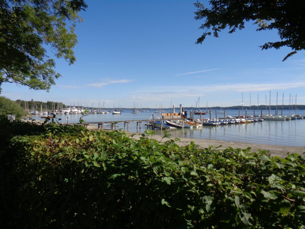 Eching am Ammersee (Nordufer). Beim Verlassen des Ammersees wechselt die Ammer ihren Namen. Ab jetzt heißt sie Amper. Sie wird bei Moosburg in die Isar münden. Soweit werde ich aber nicht radeln.