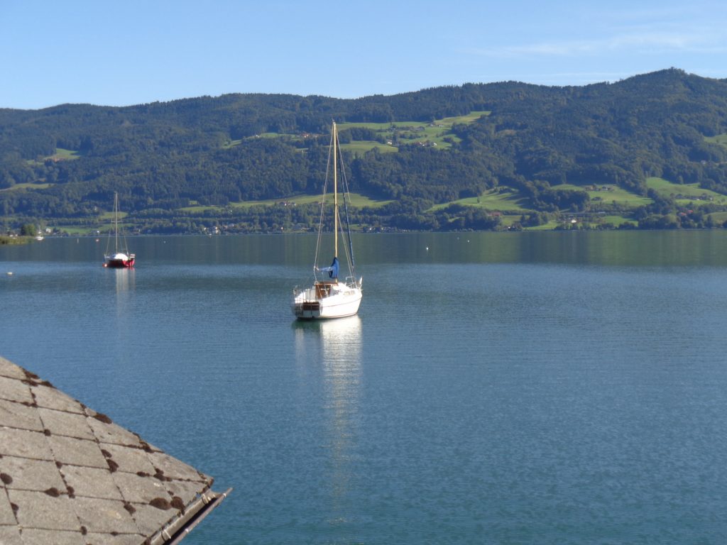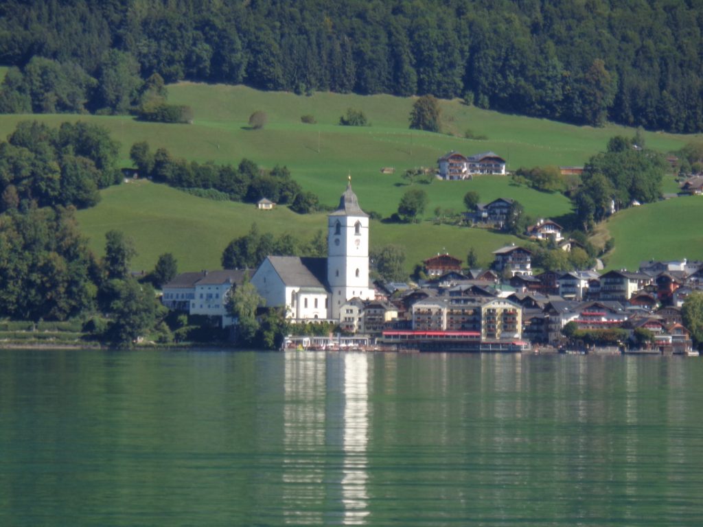 Bei Reith ein (gezoomter) Blick auf das gegenüberliegende Ufer: St. Wolfgang im Salzkammergut.