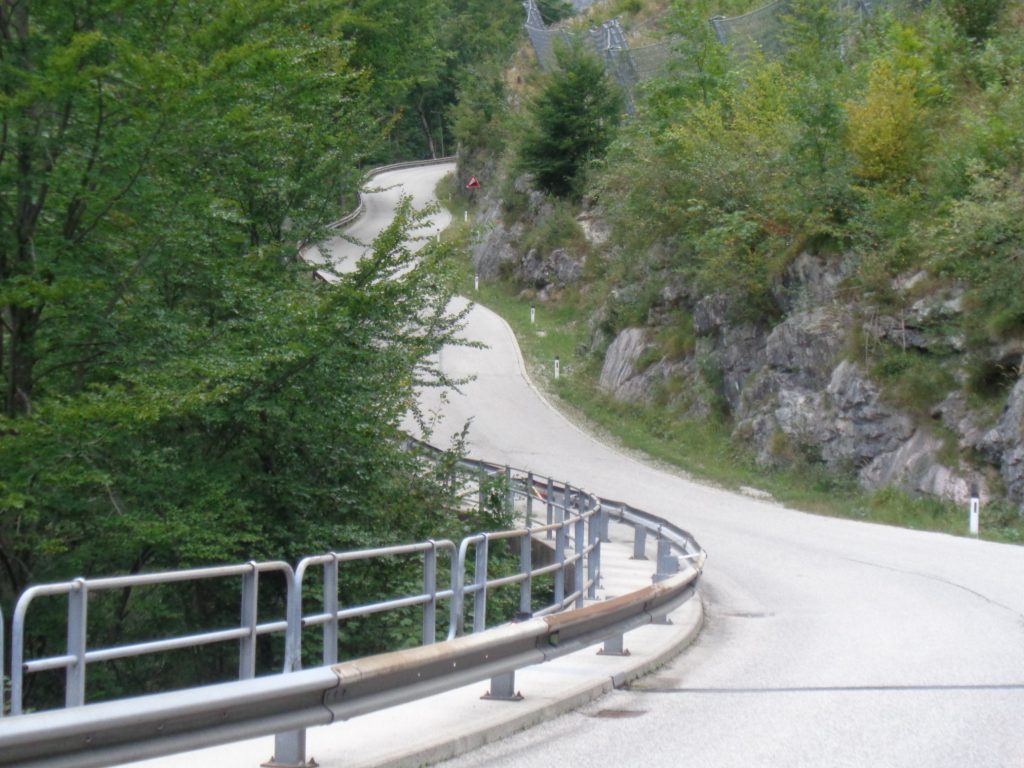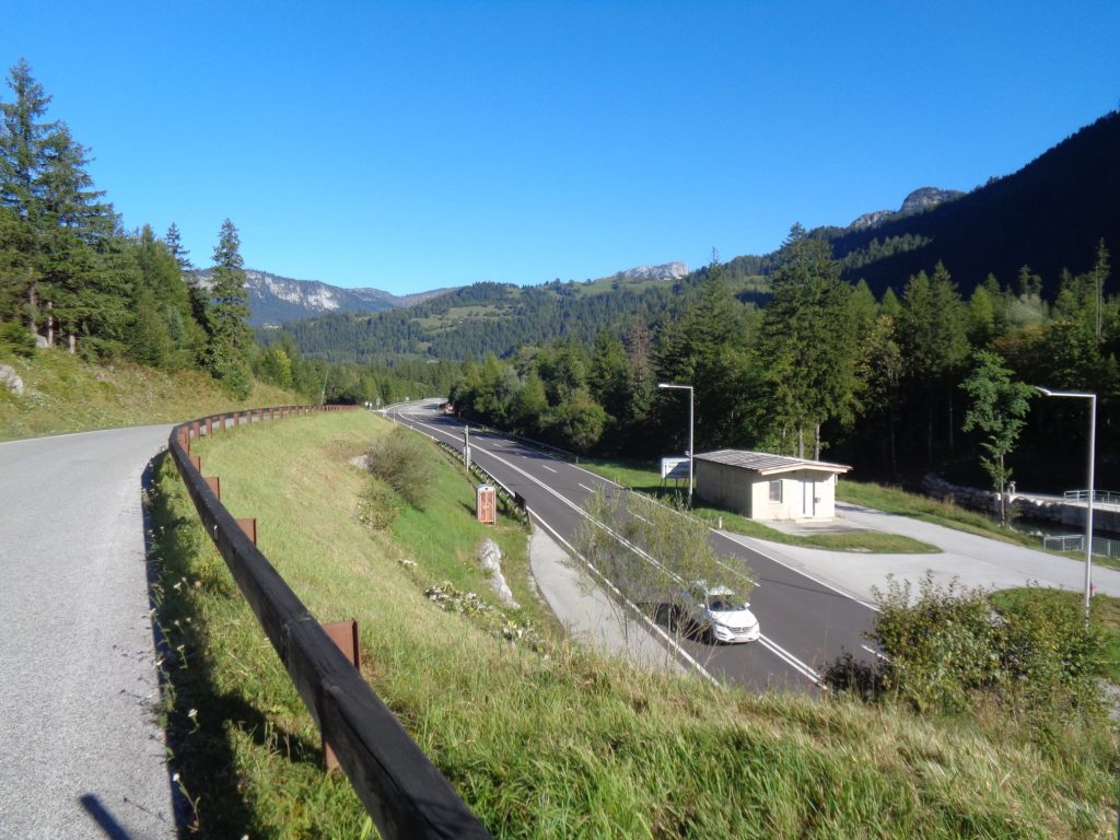 Nach der Ortschaft Untergrimming geht’s auf der alten Bundesstraße in zwei Etappen steil bergan. Hier nach dem 1. Anstieg. Links alt, rechts neu.
