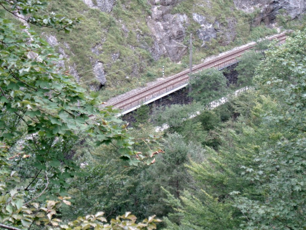 Die L 547 Bad Aussee – Obertraun war eigentlich wegen Straßenbelagsarbeiten gesperrt. Es hat den Arbeitern gar nicht gefallen, dass Radler trotzdem diese Straße befuhren. Aber es war keine Umleitung ausgeschildert. So hatten die Radler die Landstraße für sich allein. Es gab nämlich einen Abschnitt mit 23 % Gefälle (auf 700 m). Danach Blick ins Tal auf die Bahntrasse.