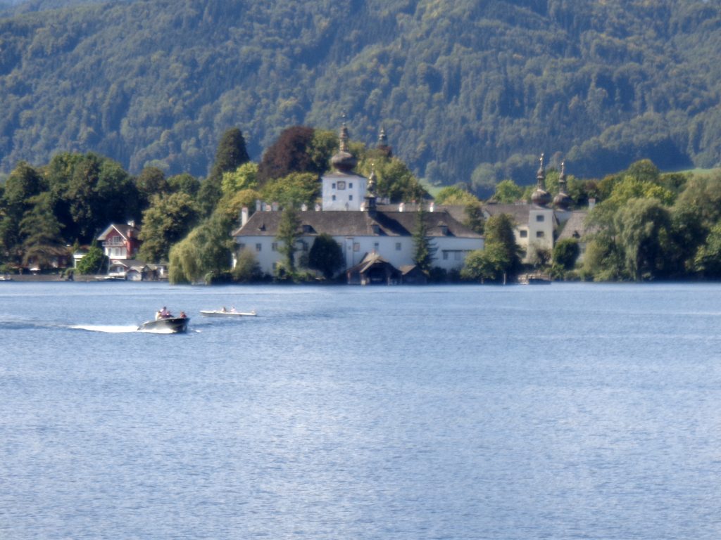 Blick auf Schloss Ort am Traunsee (gezoomt). – Also radle ich weiter zur Zwischenübernachtung in Lenzing. – 70 Tages-km.