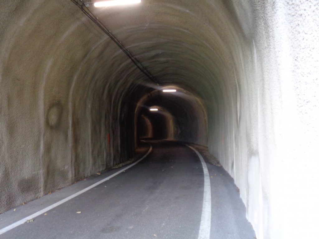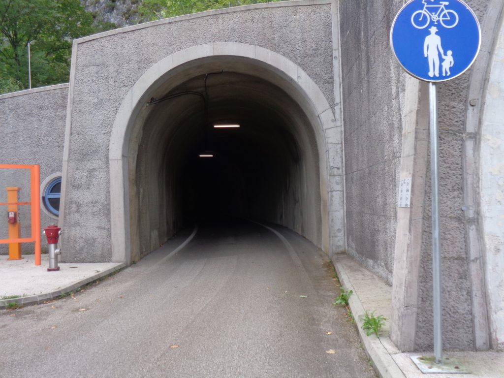 Langer, beleuchteter Fahrrad- und Fußgängertunnel am Ufer des Mondsees, der PKW-Tunnel verläuft separat nebenan.
